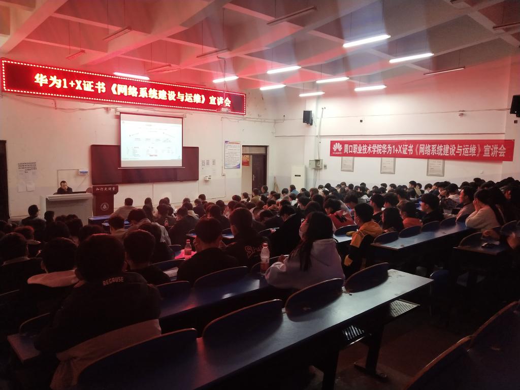 为全面贯彻《国家职业教育改革实施方案》精神,推进产教融合,进一步落实“1+X”证书制度试点工作,加快万象城官网各专业人才培养工作的发展,提升学生专业能力,awc777万象城娱乐官网于3月24号下午2:30在五区多媒体一楼举行“华为1+X证书网络系统建设与运维”宣讲会,awc777万象城娱乐官网全体教师,19级、20级计算机网络技术专业全体学生和计算机应用技术专业部分学生代表参加了此次宣讲会,会议由副院长陈鹏主持。