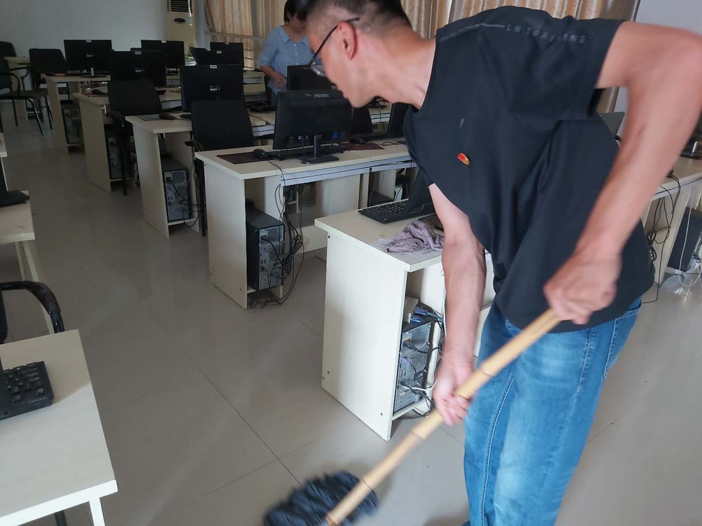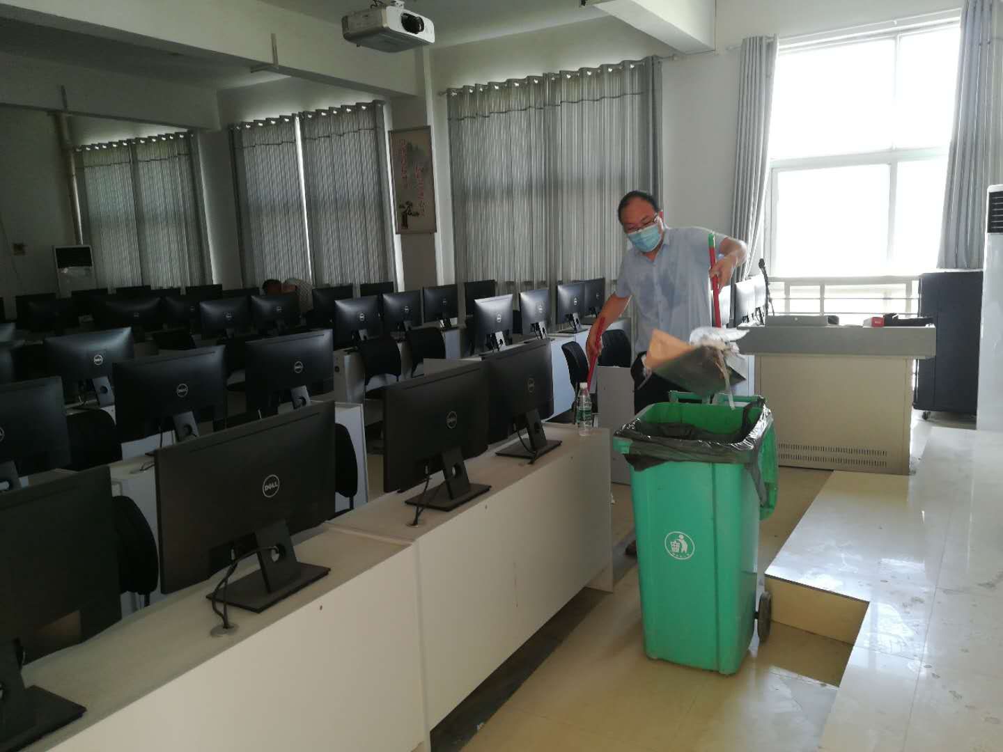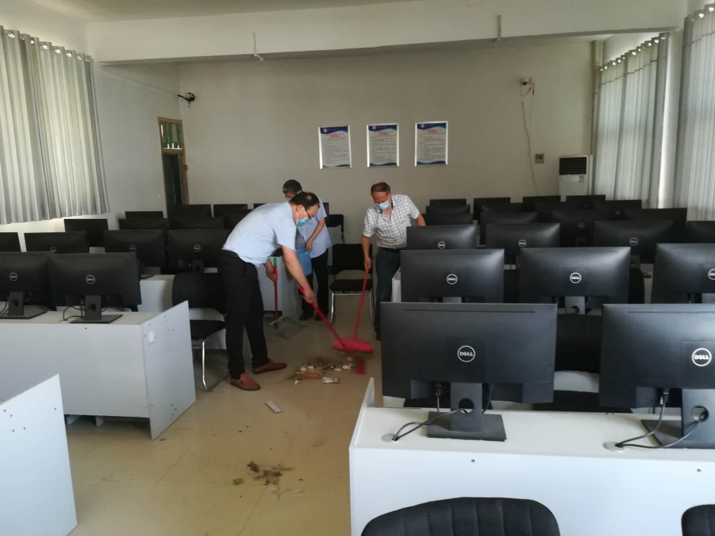 万象城官网党总支书记李强、院长李思广亲自动手打扫,老师们深受鼓舞,大家发扬不怕脏、不怕累的精神,按照分工全方位打扫每一间教室和每一间实训室,不留任何死角,并进行全方位消毒。
