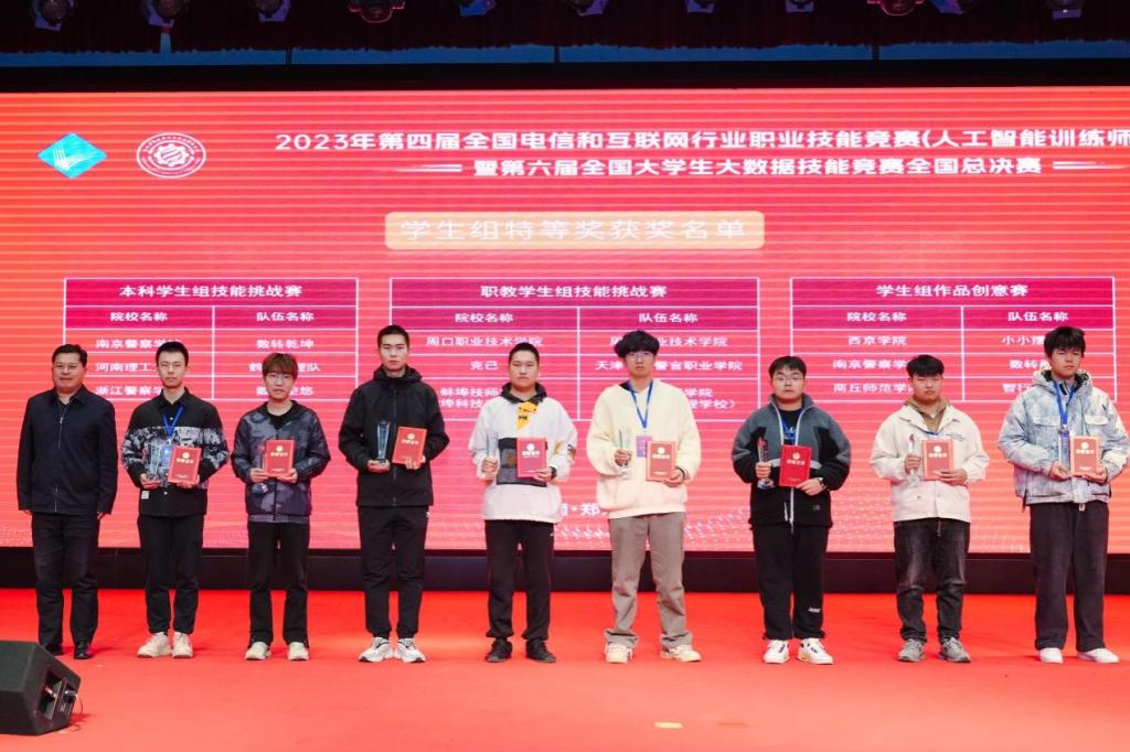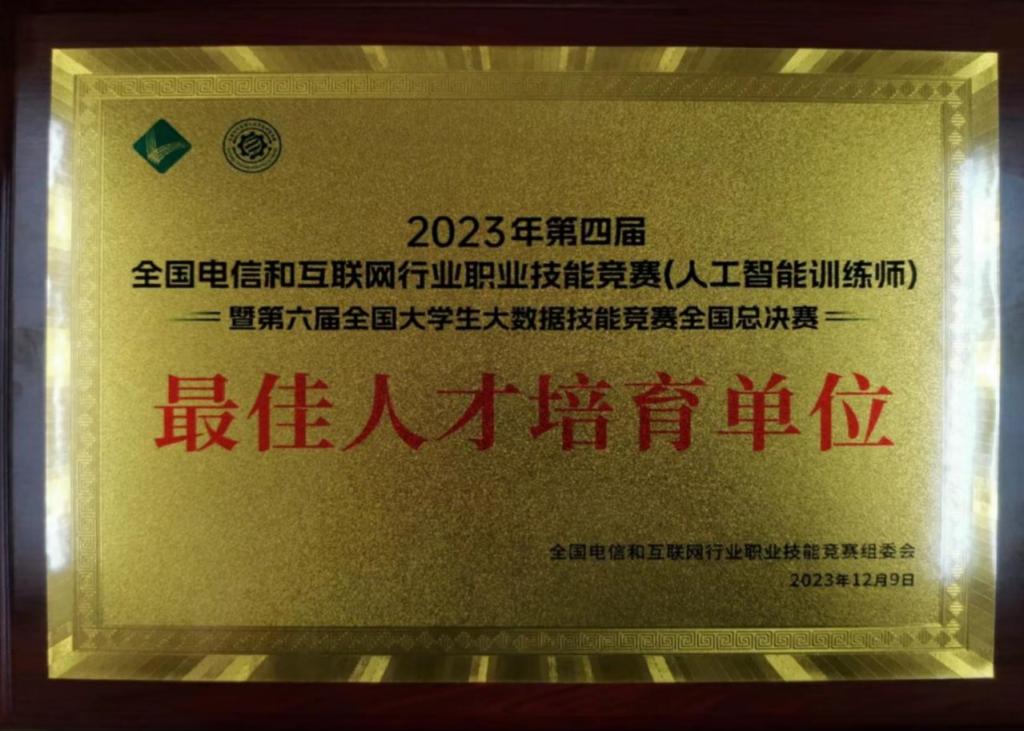 12月9日,第四届全国电信和互联网行业职业技能竞赛(人工智能训练师)暨第六届全国大学生大数据技能竞赛全国总决赛在河南郑州闭幕。awc777万象城娱乐官网楚书来、冯腾霄两位老师指导,由孙梦杰、李豪宇、李金普三名同学所组校队代表河南省参加该赛项全国总决赛,比赛中同学们沉着冷静,发挥出应有水平,最后经过四个小时的多轮比拼,以446分的成绩稳居榜首,取得职教组特等奖,这也是万象城官网在该赛项上的最好成绩。此外楚书来、冯腾霄两位老师获得全国电信和互联网行业职业技能竞赛组委会颁发的“优秀指导教师”,学校荣获“最佳人才培育单位”。