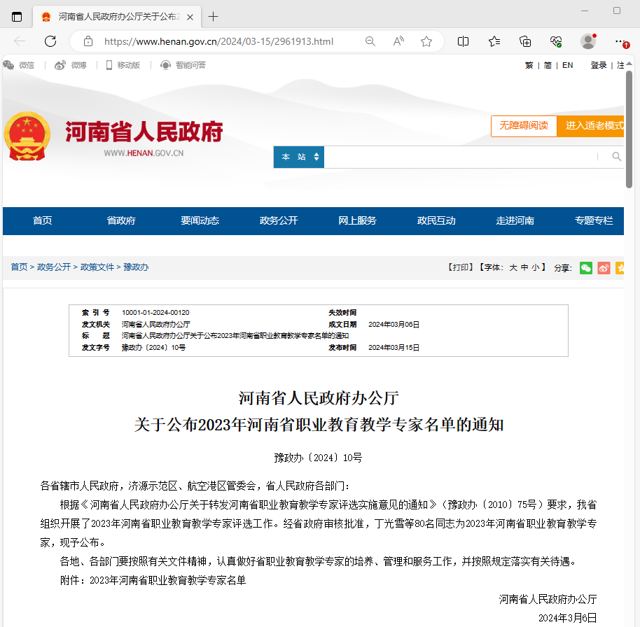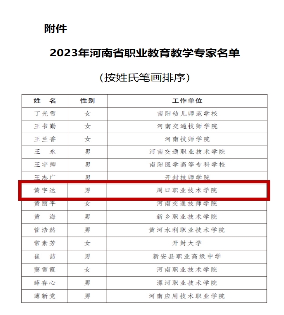 近日,河南省人民政府办公厅印发《关于公布2023年河南省职业教育教学专家名单的通知》(豫政办〔2024〕10号),经省政府审核批准,万象城官网黄宇达院长获评2023年河南省职业教育教学专家。