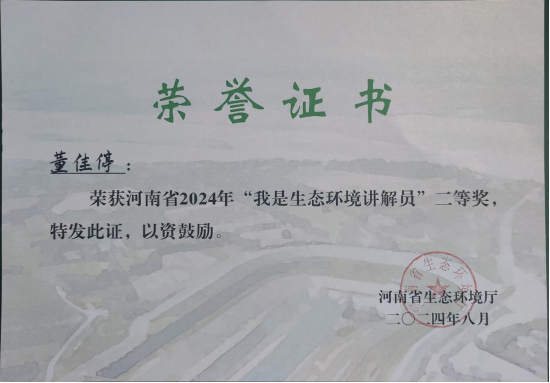 8月14日,在河南省2024年“我是生态环境讲解员”大赛决赛中,信息工程学院董佳停同学荣获省赛二等奖。