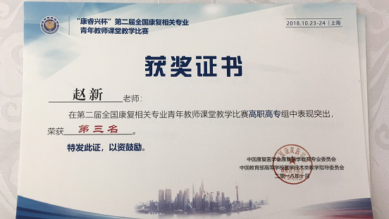 10月24日至26日,第二届全国康复专业青年教师课堂教学比赛在上海中医药大学举行,beat365官网医学院康复专业赵新老师荣获高职高专组三等奖。