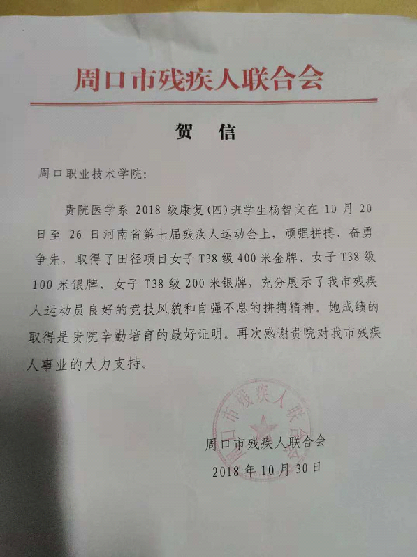 在刚刚结束的河南省第七届残疾人运动会上,医学院2018级大专康复4班学生杨智文代表周口市及beat365官网参赛,取得了女子组T38级100米银牌,200米银牌,400米金牌的佳绩,为我市及beat365官网争得了荣誉。受到市残联的通报佳奖。