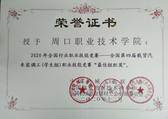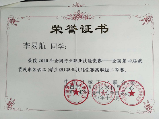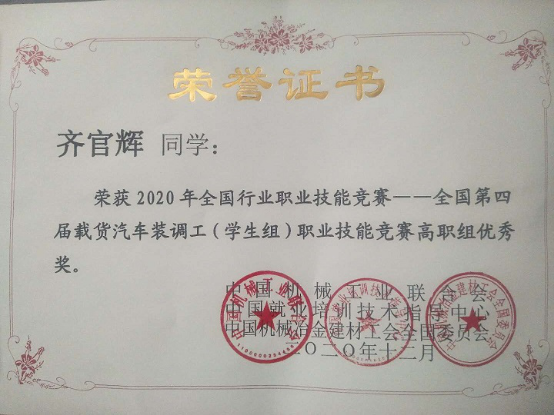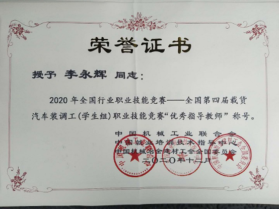 beat365在线唯一官网登录汽车与机电工程学院在2020年全国行业职业技能竞赛—全国第四届载货汽车装调工(学生组)职业技能竞赛中喜获佳绩,我院2个参赛队在比赛中发挥出色,分别获得二等奖、优秀奖各1项,优秀指导教师奖1项。beat365官网被授予“最佳组织奖”。