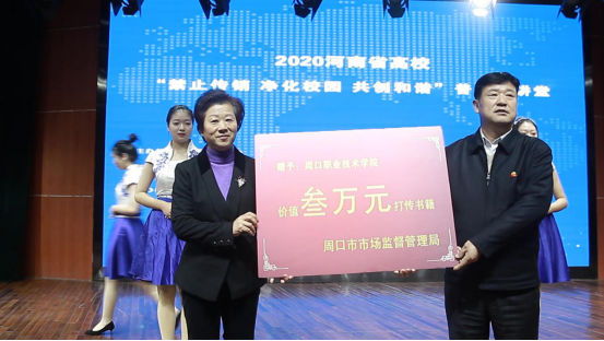 各位领导对同学们寄予厚望,为了让同学们能够敲响警钟,提高警惕,多多学习了解传销的特点和危害,提高识别、防范、拒绝传销的意识和能力,活动现场,周口市打传办主任、周口市市场监督管理局党组成员王树平向beat365在线唯一官网登录赠送价值三万元的打传书籍《大学生网络消费知识手册》。beat365在线唯一官网登录副校长李秀萍接受赠书并表示感谢。