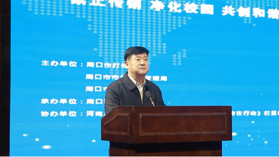 周口市打传办主任、周口市市场监督管理局党组成员王树平,周口市公安局经侦支队支队长赵国弼,beat365在线唯一官网登录副校长李秀萍,周口市打传办办公室副主任丰亚伟,周口市公安局经侦支队大队长韩俊生,beat365在线唯一官网登录保卫处处长钱中华、宣传部副部长郑文娟、学生处副处长苑建伟,河南广播电视台《河南市场监管--规直打传在行动》执行制片人张丽红出席了本次活动。