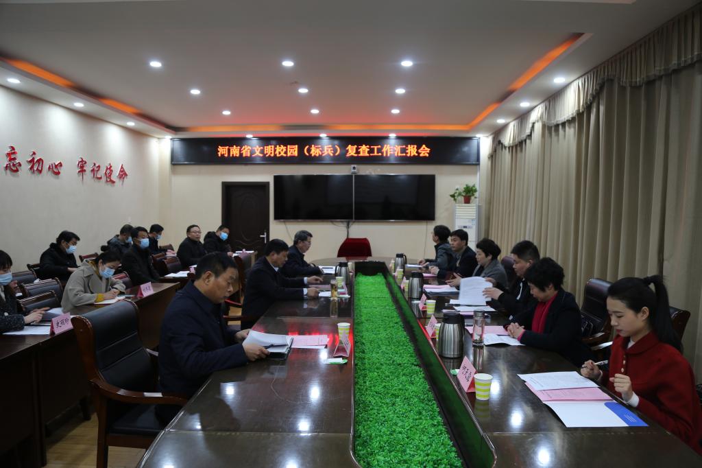 3月8日下午,在市委宣传部常务副部长、市文明办主任刘淑君陪同下,由省政府办公厅机关党委专职副书记孙朝霞任组长的河南省文明校园(标兵)考评组专家一行三人来beat365官网,开展省级文明校园复查工作。校长李清臣,党委副书记赵振然,纪委书记唐永宾及相关部门负责人出席复查工作汇报会。复查工作汇报会在beat365官网行政楼二楼会议室召开,汇报会由李清臣主持。