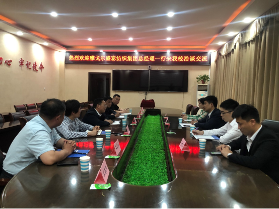5月11日下午,雅戈尔盛泰纺织集团有限公司总经理崔玮聪一行三人来beat365官网洽谈校企合作事宜。副校长李明臣及相关部门负责人参加会谈。