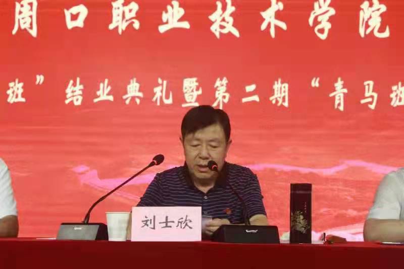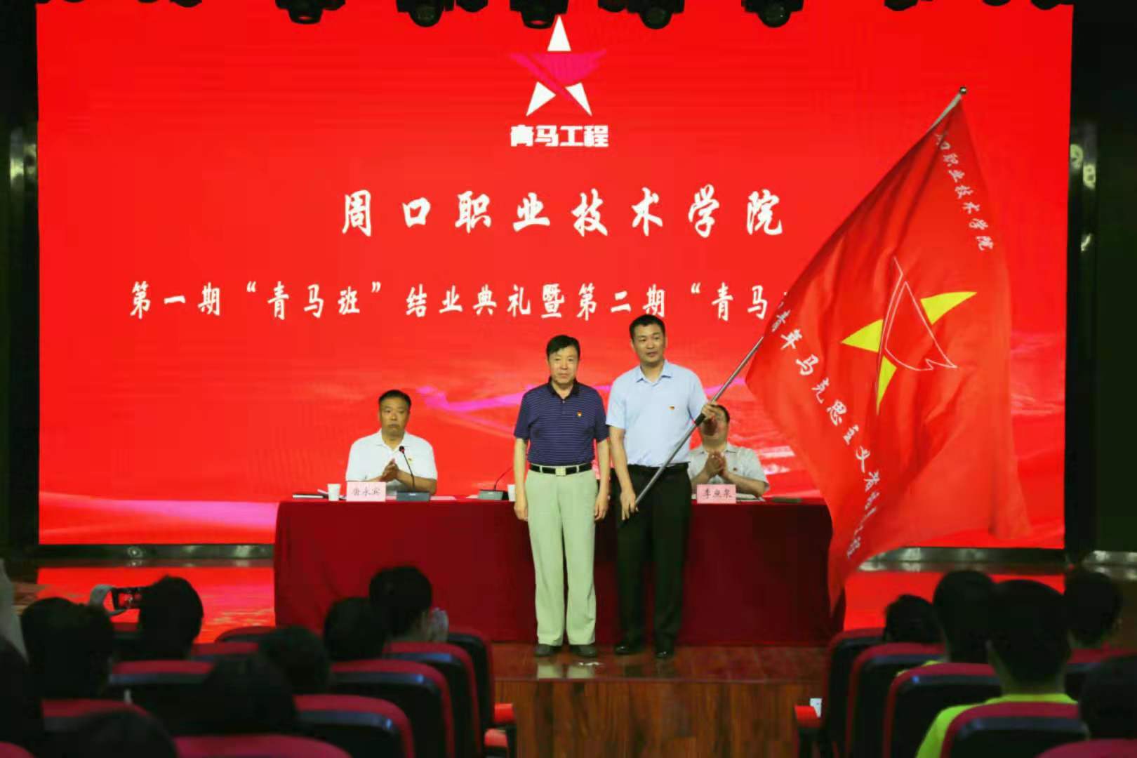 党委书记刘士欣为第二期“青马班” 授旗并做最后讲话,班主任普俊老师接受授旗。