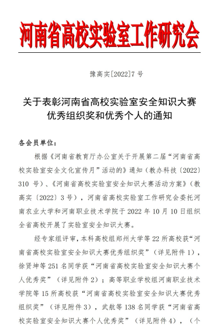 近日,河南省高校实验室工作研究会公布了河南省高校实验室安全知识大赛优秀组织奖和优秀个人名单,beat365官网荣获“河南省高校第二届实验室安全文化宣传月”实验室安全知识大赛优秀组织奖,建筑工程学院孙永强等9名同学获得河南省高校实验室安全知识大赛优秀个人。