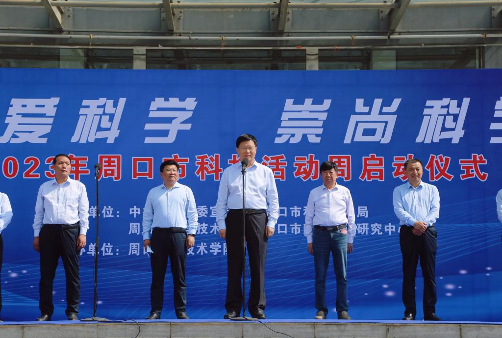 周口市科学技术局党组书记、局长韦刚致辞,他表示,将组织广大科技工作者和科普工作者,深入社区、中小学校等开展形式多样的科普服务,大力普及科技知识,弘扬科学精神,传播科学思想,倡导科学方法,为推动周口高质量发展作出新的更大贡献。