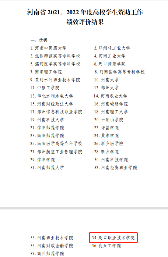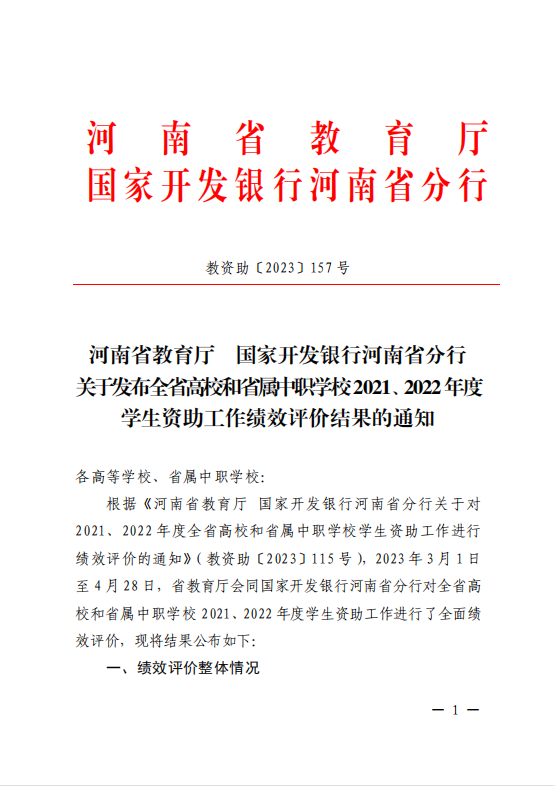 近日,河南省教育厅、国家开发银行河南省分行联合印发了《关于发布全省高校和省属中职学校2021、2022年度学生资助工作绩效评价结果的通知》,beat365官网在此次全省学生资助工作绩效评价中被评为“优秀”等级。