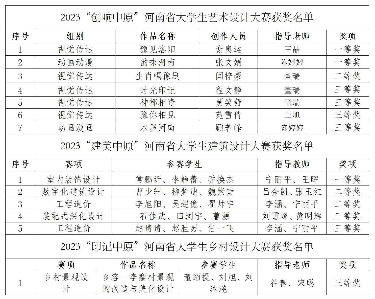近日,河南省教育厅公布2023“设计河南”系列大学生学科竞赛获奖名单,beat365官网共有13个团队或个人获奖,其中一等奖3项,二等奖3项,三等奖7项。