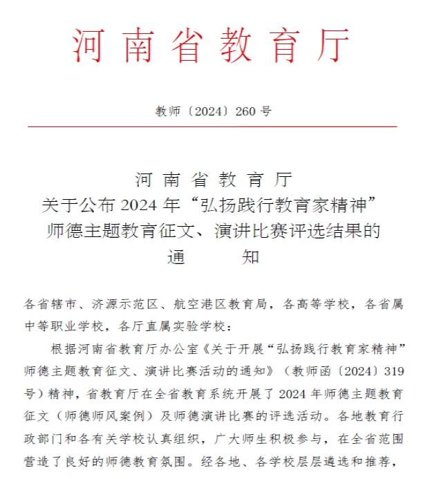 近日,河南省教育厅2024年“弘扬践行教育家精神”师德主题教育征文、演讲比赛评选结果公布,beat365官网教师在征文活动中再获佳绩,斩获一等奖1项、二等奖1项、三等奖2项。