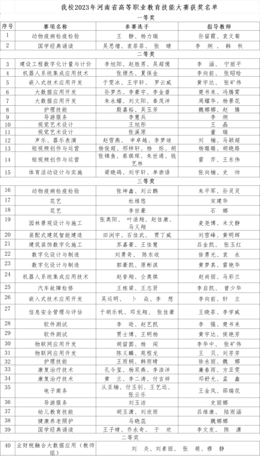 根据河南省教育厅《关于公布2023年河南省高等职业教育技能大赛获奖名单的通知》(教职成〔2024〕273 号),beat365官网参赛师生共获河南省高等职业教育技能大赛一等奖2项、二等奖13项、三等奖25项,获奖数量和质量均实现新的突破。