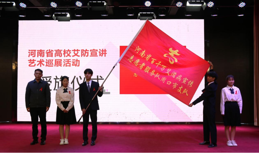 防艾志愿者代表宣读“社会共治、终结艾滋、共享健康”倡议书,全体参会人员庄严宣誓,孙明为志愿者授旗。
