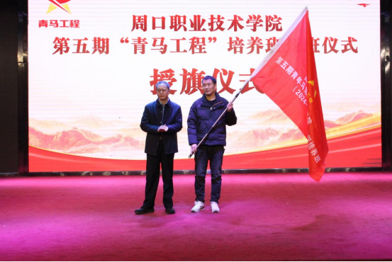郭汝礼为第五期“青马工程”培养班郑重授旗,班主任普俊老师接受授旗。