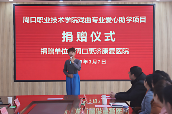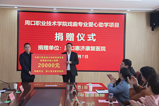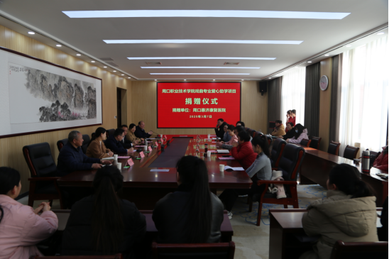 3月7日上午,周口惠济康复医院爱心助学捐赠仪式在beat365官网开元校区第六会议室成功举行。周口惠济康复医院院长王希振、beat365在线唯一官网登录副校长王隼出席仪式,学前与艺术教育学院院长高岐奎主持。