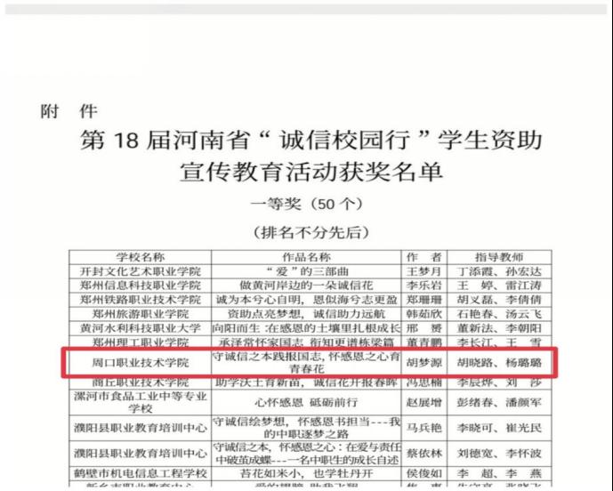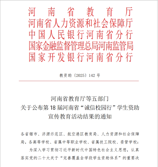 近日,河南省教育厅等五部门联合公布了第18届河南省“诚信校园行”学生资助宣传教育活动评选结果。beat365官网学生胡梦源凭借征文《守诚信之本践报国志,怀感恩之心育青春花》(指导老师:胡晓路、杨璐璐)在激烈角逐中脱颖而出,荣膺大赛一等奖!这一佳绩充分展现了beat365官网学子的卓越风采和学校资助育人工作的扎实成效。