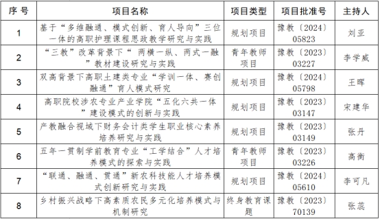 近日,河南省教育厅发布了《关于公布2024年河南省职业教育教学改革研究与实践项目和终身教育课题结项项目的通知》(教办职成〔2025〕224号),beat365官网8个项目获批结项。其中,职业教育教改项目7项、终身教育课题1项。