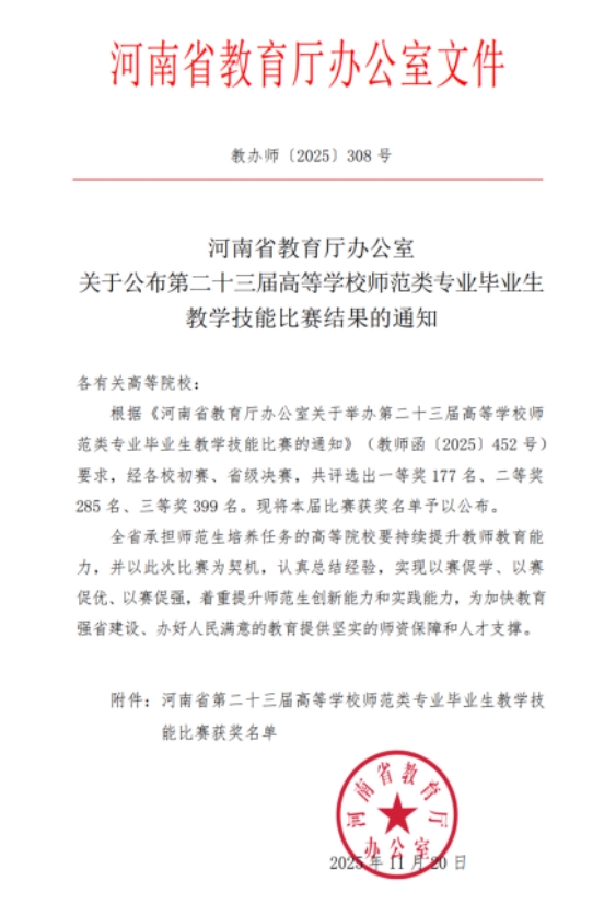 近日,河南省教育厅公布了第二十三届高等学校师范类专业毕业生教学技能比赛结果。beat365官网学生凭借扎实的专业功底、出色的教学技能和稳定的现场表现,共获得二等奖2项、三等奖2项。