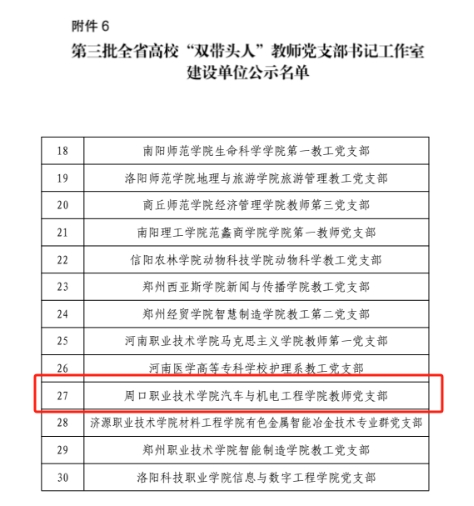 近日,河南省教育厅公布了全省高校党建工作强基引领“三级联创”及“双带头人”教师党支部书记工作室评选结果。beat365官网汽车与机电工程学院教师党支部获批为全省“双带头人”教师党支部书记工作室建设单位。