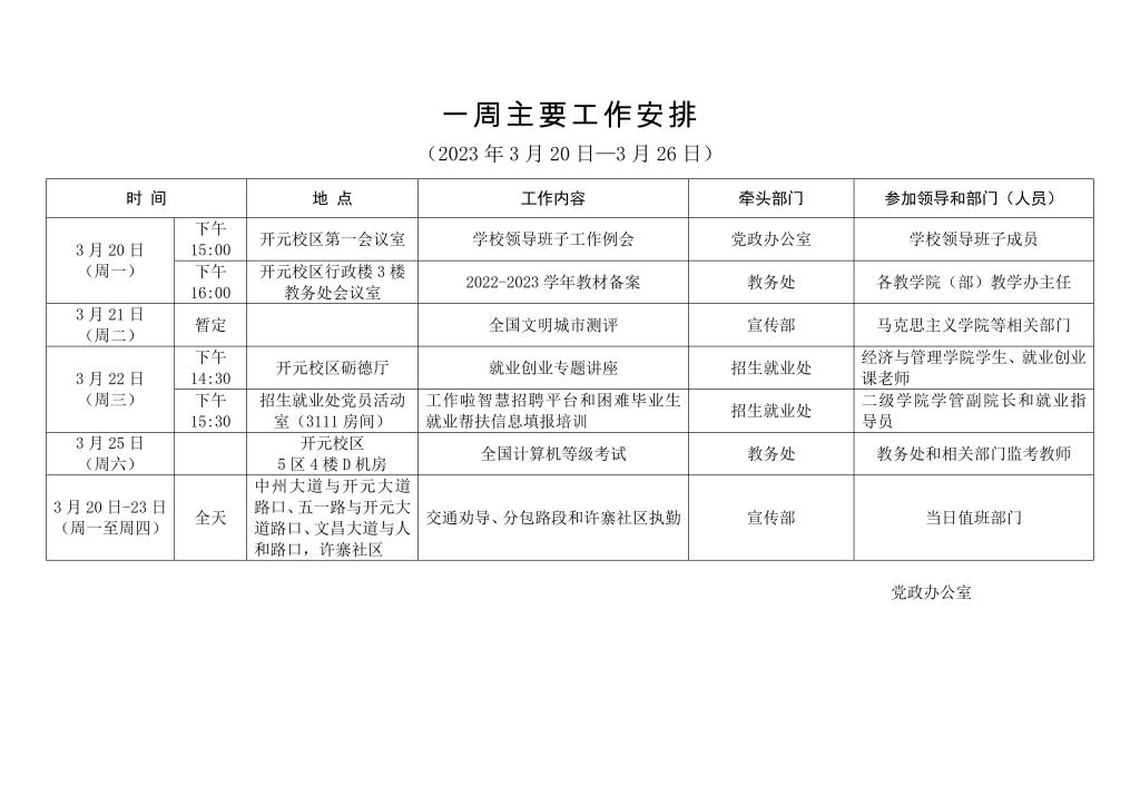 一周主要工作安排(2023年3月20日-3月26日)