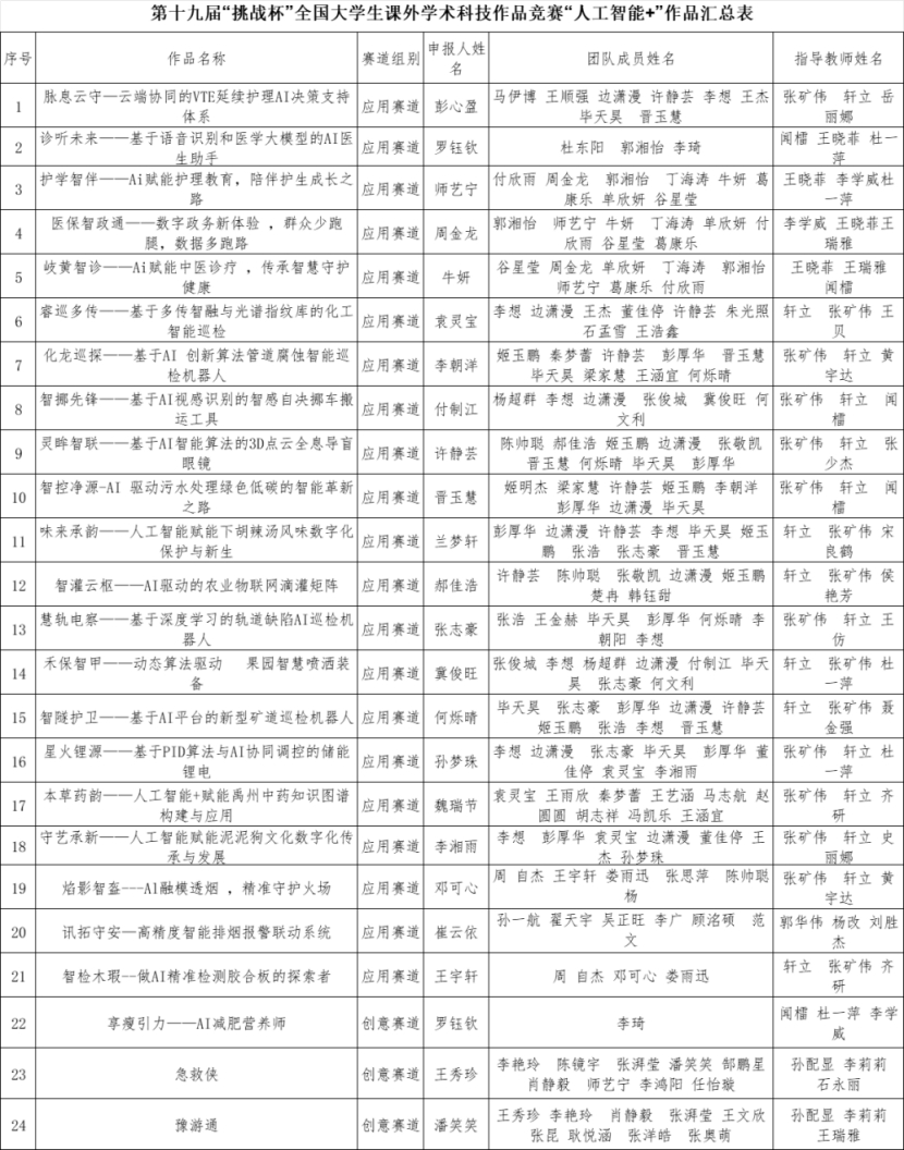 根据第十九届“挑战杯”全国大学生课外学术科技作品竞赛“人工智能+”专项赛相关要求,beat365官网团委组织开展第十九届“挑战杯”全国大学生课外学术科技作品竞赛“人工智能+”专项赛工作。经个人申报、学校团委审核等环节,现将拟推荐第十九届“挑战杯”全国大学生课外学术科技作品竞赛“人工智能+”专项赛的项目作品名单予以公示,具体名单如下: