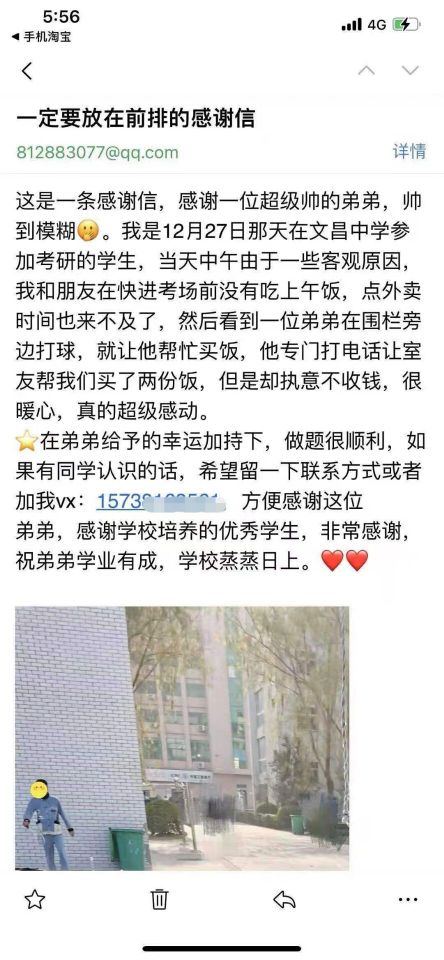 陌生的暖心举动,让小杨感激在心。由于当时匆忙,她没有来及留下男生的姓名和联系方式,只是慌忙中拍下了男生一张模糊的身影。事后,小杨查找到学校的电子信箱留言,写信讲述事情经过,于是才有了开头的一幕。