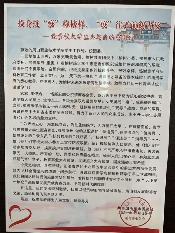 共青团榆树市委员会在感谢信中说到:榆树共青团受中共榆树市委、榆树市人民政府委托,向贵学府李奥1名榆树籍大学生志愿者们致以诚挚的感谢和崇高的敬意!感谢他不畏艰险、奋勇向前,积极投身家乡的抗疫斗争,报效桑梓;感谢贵学府所有教育工作者,立言立行,为“天下第一粮仓”培育德才兼备的嘉木栋梁!感谢贵学府的悉心教导,立德树人,为榆树未来发展培育出讲奉献、敢担当的新一代青年才俊!谢谢你们!