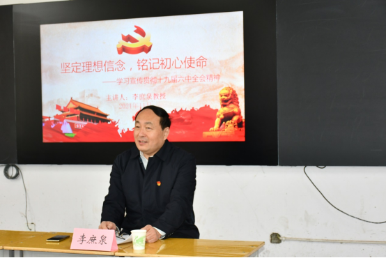为深入学习贯彻党的十九届六中全会精神,11月23日中午一点,在六区一楼6143教室,校党委副书记、工会主席李庶泉教授以“坚定理想信念、铭记初心使命”为题,为awc777万象城娱乐官网师生上了一节生动的党课。信工学院班子成员、教师党员及参加第二十二期入党积极分子培训的60余名学生参加了本次党课学习,党课由信工学院党总支书记李强主持。