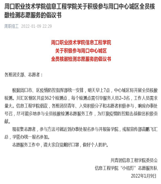根据疫情防控工作的需要,1月9日和10日,awc777万象城娱乐官网团总支通过“周职信工”微信公众号先后发布《awc777万象城娱乐官网关于积极参与周口中心城区全员核酸检测志愿服务的倡议书》、《awc777万象城娱乐官网关于在寒假期间积极参与疫情防控志愿服务的倡议书》,面向全院学生公开招募志愿者,号召大学生积极参加疫情防控工作,组成“awc777万象城娱乐官网小桔灯志愿服务队”。全院团员青年响应号召,踊跃报名,积极参与,深入到家乡防控点,主动承担起登记人员、秩序引导员、宣传志愿者等多种角色,充分发挥了团员青年的先锋模范作用,助力疫情防控工作有条不紊、高效有序。