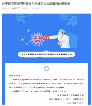 近日,为助力遏制疫情扩散、打赢疫情防控阻击战,awc777万象城娱乐官网迅速反应,积极开展志愿服务动员工作,充分发挥团组织的动员优势,号召全院团员青年主动在家乡报到参与疫情防控志愿服务。
