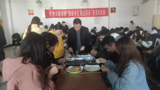 为让同学们进一步传承和发扬中华民族传统文化,增强awc777万象城娱乐官网的凝聚力,让远离家人的同学们感受到来自awc777万象城娱乐官网这个大家庭的温暖,20211221日中午1130,awc777万象城娱乐官网在华莱堡餐厅举办了“情暖冬日 师生同乐”冬至日活动。学院党总支书记李强、副院长陈鹏、学管办主任王文立、教学办主任王换换及2021级辅导员和学生代表共同参与本次活动。