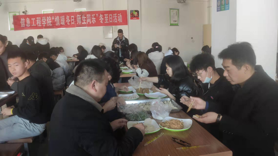 上午11:30分,“情暖冬日 师生同乐”冬至日活动准时开始,师生们围坐在一起开始大展身手,同学们别出心裁地包着饺子并设计成元宝、月牙等形状,寓意着学院各项事业蒸蒸日上;在包饺子的同时,师生围绕学习、生活、工作等话题不时交谈着,师生之间其乐融融,师生的感情也随之加深。最后,在师生们共同努力下,一碗碗热气腾腾的饺子被端上了餐桌,同学们都感受到了劳动的快乐,冬至节日的暖暖心意,都融入到了温暖的信工学院大家庭。