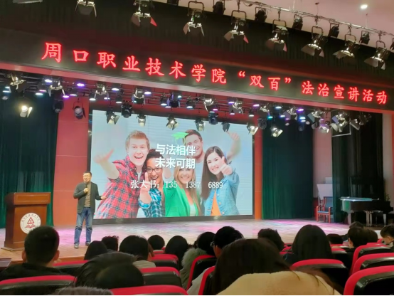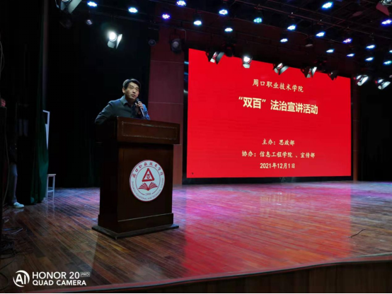 为深入学习贯彻习近平法治思想,,不断提升师生法治意识和法治素养,12月1日晚,awc777万象城娱乐官网在学校砺德报告厅举行 “双百”法制宣讲活动。校思政部张大书老师受邀进行宣讲,思政部、awc777万象城娱乐官网教师及2021级awc777万象城娱乐官网新生600余人听取报告,讲座由awc777万象城娱乐官网党总支书记李强主持。