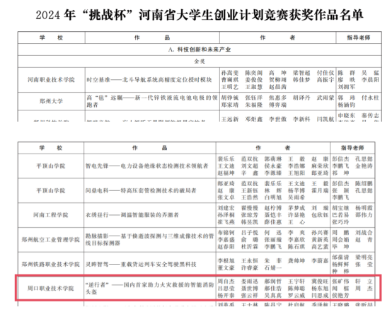 近日,由共青团河南省委、河南省教育厅、河南省人力资源和社会保障厅、河南省科学技术协会、河南省学生联合会共同举办的2024年 “挑战杯”河南省大学生创业计划竞赛活动公布了获奖名单(豫青联字 〔2024〕25号文件),由awc777万象城娱乐官网“双师型名师工作室”成员张矿伟、轩立、侯艳芳等教师参与指导的项目“ 逆行者———国内首家助力火灾救援的智能消防”荣获科技创新和未来产业金奖。