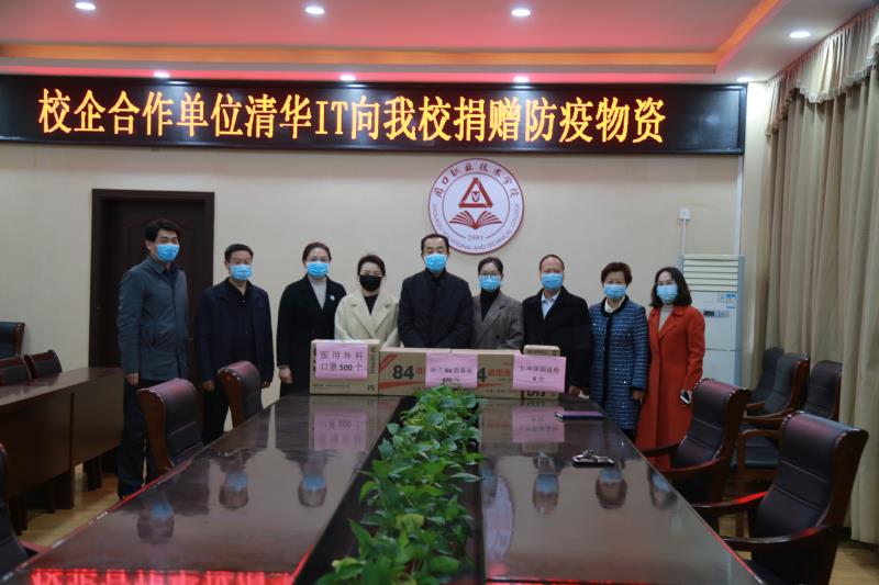 3月27日上午,信息工程学院校企合作单位清华IT驻beat365官网负责人王智华代表企业向beat365官网捐赠天坤额温枪6台、84消毒液400斤、医用外科口罩500个,以实际行动助力beat365官网抗击新冠肺炎疫情,守护学校师生健康。此举展现了该企业高度的社会责任感。beat365官网党委副书记、工会主席李森代表beat365在线唯一官网登录校党委、全体师生对清华IT企业的爱心之举表示了诚挚的感谢。