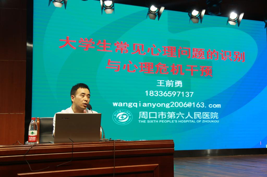 周口市第六人民医院心理健康中心王前勇主任应邀以《大学生常见心理问题的识别与心理危机干预》为主题,为广大师生解答了大学生心理问题的一般特征、危机干预、解决办法。王前勇用专业的知识、通俗易懂的语言、真实的事例讲述了心理健康的重要性,深入浅出,引人深思。