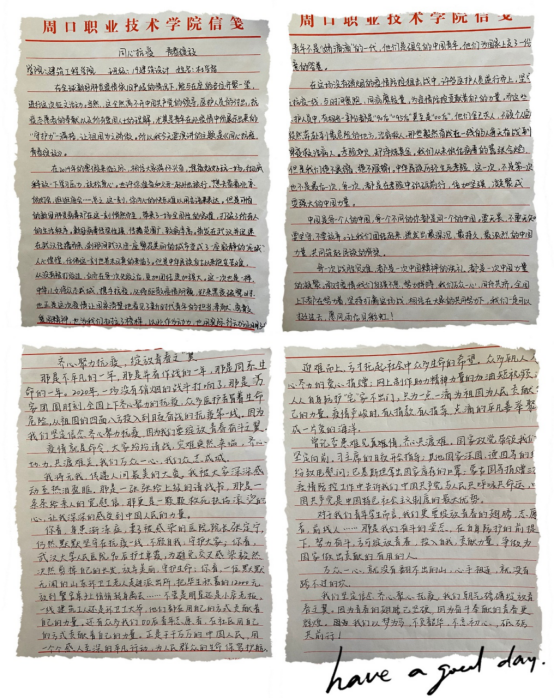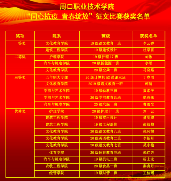 文化教育学院李云香《齐心凝聚抗疫,绽放青春之“翼”》以清新流畅的文笔展现了当代青年应以梦为马,不负韶华,不忘初心,砥砺前行,传递了青春正能量。建筑工程学院杜学雷《同心抗疫青春绽放》以故事为主线,通过一个个鲜活生动的例子,展现出中国人民的强大凝聚力!