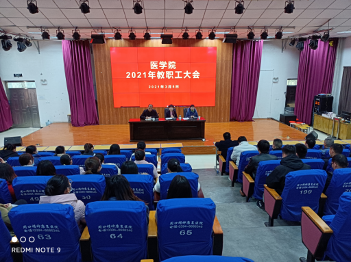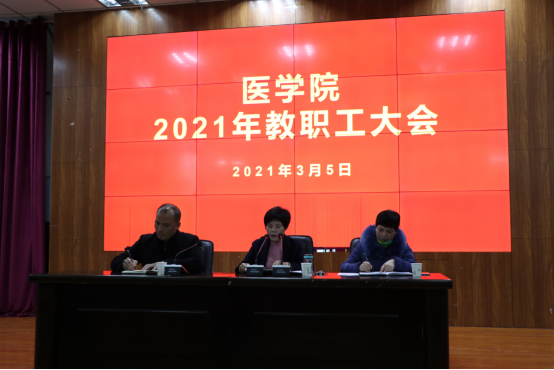 3月5日下午,为新学期工作开好头、起好步,进一步统一思想、振奋精神、凝聚共识,高标准做好2021年工作,医学院在文昌校区报告厅召开了2021年全体教职工会议。院长王金玲、副院长吴秀丽、郭瑞和医学院全体教职工参加了会议。会议由副院长吴秀丽主持。