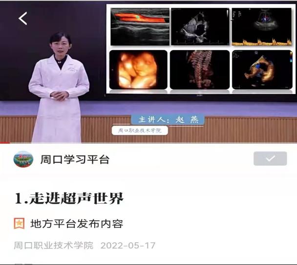 近日,医学院赵燕老师团队推出的《超声诊断学》课程成功入选“学习强国”慕课。此前,该课程已经入选省级精品线上开放课程项目,并在智慧职教MOOC学院(慕课)网络播发。