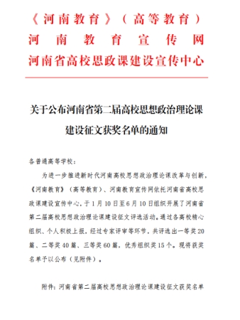 为进一步推进新时代河南高校思想政治理论课改革与创新,《河南教育》(高等教育)、河南教育宣传网依托河南省高校思政课建设宣传中心,于2022年1月10日至6月10日组织开展河南省第二届高校思想政治理论课建设征文评选活动。beat365官网马克思主义学院高度重视,积极组织各课程组深入研讨和总结课程教学中的经验教训、问题对策,撰写论文并积极参赛。以此次比赛为契机,不断提升广大教师教学能力和业务素养,进而起到带动引领作用,提高整体教学研究水平。
