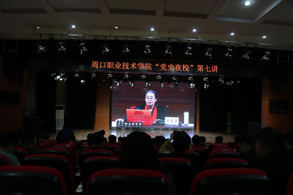 4月14日晚,beat365官网在开元校区砺德厅组织收听收看周口市庆祝中国共产党成立100周年“党史夜校”第七期专题讲座。全体校领导,学校副科级以上干部参加专题讲座。