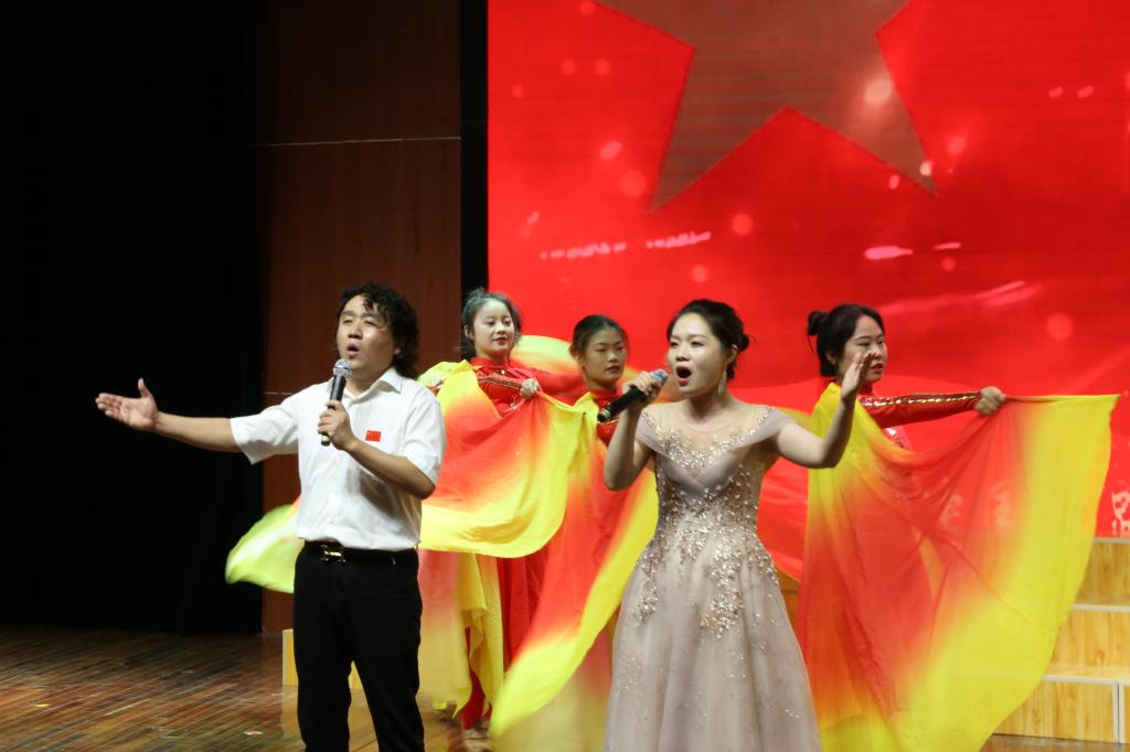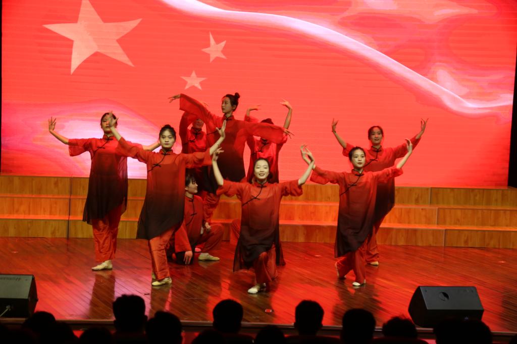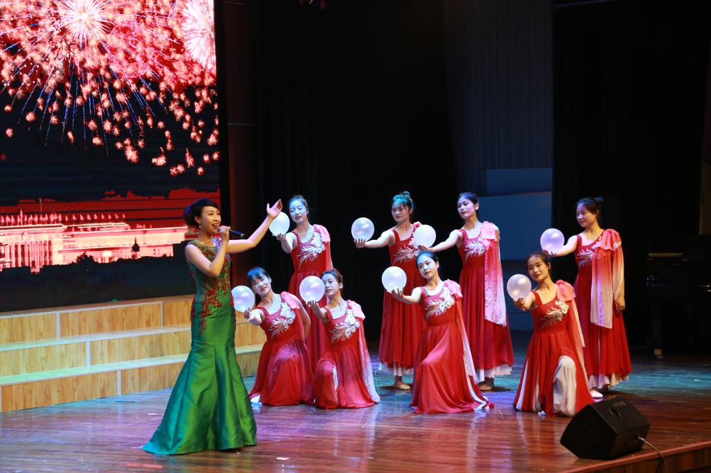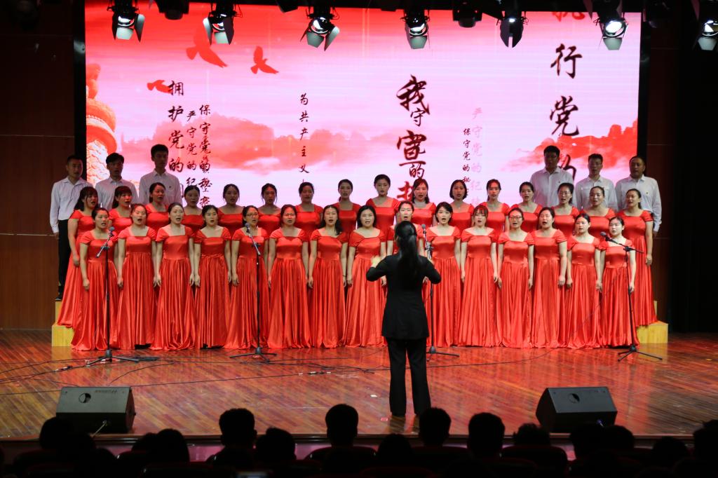 百年传承,薪火相继,每一次红旗的升起,都给我们带来心灵的震撼和青春的感悟,文艺演出在舞蹈《红旗颂》中拉开序幕。歌曲《灯火里的中国》歌唱祖国的繁荣富强,歌唱小康社会里的幸福生活。感悟家国情怀,激扬雄心壮志,送上了对祖国母亲的美好祝福;红色歌曲联唱《刘胡兰》《洪湖水浪打浪》《映山红》《党的儿女》让现场观众在歌声中寻找红色年代的深刻回忆;由38名党员辅导员组成的追梦合唱团演唱的《我宣誓》用激情澎湃,振奋昂扬的歌声唱响了新时代、党旗下,广大党员干部“不忘初心、牢记使命”永远跟党走的主旋律。诗朗诵《辅导员,我们爱你》,学生们在舞台上回顾与老师们一同走过的青春时光,感念老师们对每位同学的辛勤付出,向老师们表达了诚挚的敬意……曼妙的舞姿、昂扬的歌声赢得现场师生情感共鸣、掌声不断,演出在高飞、杜一萍老师《不忘初心》的歌声中推向高潮。