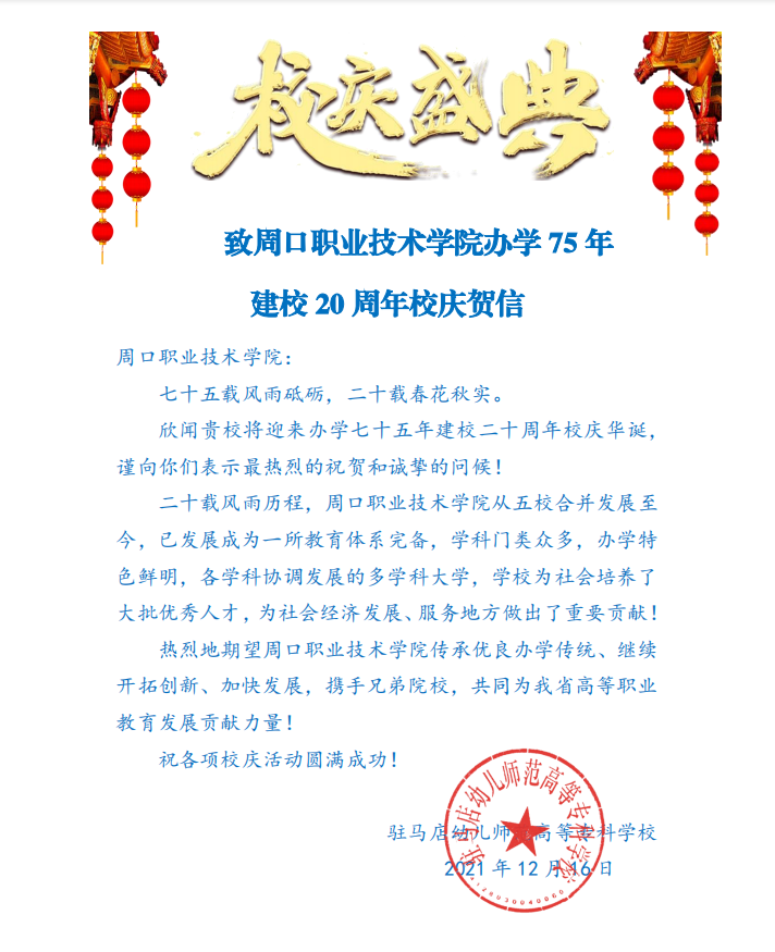 【献礼校庆】驻马店幼儿师范高等专科学校贺信